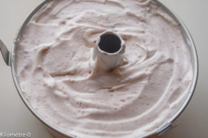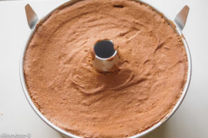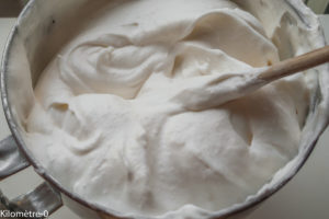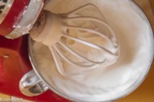 Mon premier angel cake était trop petit. Celui-là a la bonne hauteur. Mais il m’a fallu beaucoup de blancs d’oeufs. Ca tombe bien, j’en avais 550 g en stock. C’était la limite à ne pas dépasser pour mon kitchen aid car le bol mélangeur était plein à rabord.