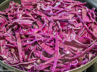 En hiver, j’aime bien le chou rouge qui mijote tranquillement comme accompagnement. Je l’ai cuit dans de la graisse de canard et l’ai servi avec du bar, un poisson blanc hautement qualitatif. Je l’achète chez un poissonnier qui me lève les filets. Quand il est cuisiné ainsi, on peut demander également à enlever la peau. Comme cela, il n’y a plus rien à faire, qu’à le poêler et à se régaler.