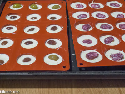Aujourd’hui, je vous propose des bouchées salées pour l’apéro revisitables à l’infini. J’en ai fait trois sortes : avec des olives, du saucisson de sanglier et juste à l’emmental (pâte de base).