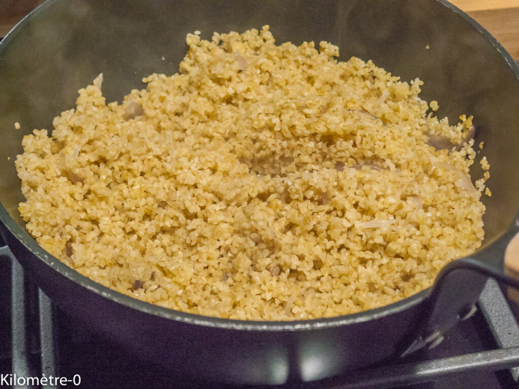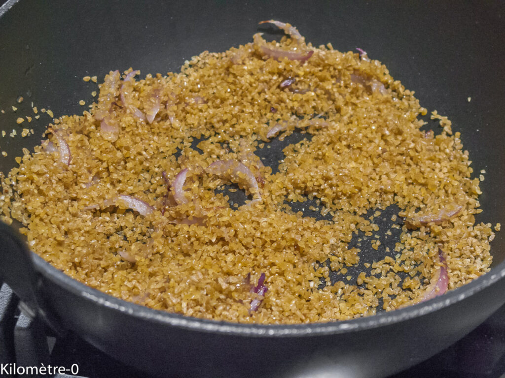 Pendant ce temps, versez le boulgour dans le bol choisi (il va vous servir de mesure pour l’eau) et versez-le dans la poêle. Remuez deux minutes pour enrober les grains dans l’huile.