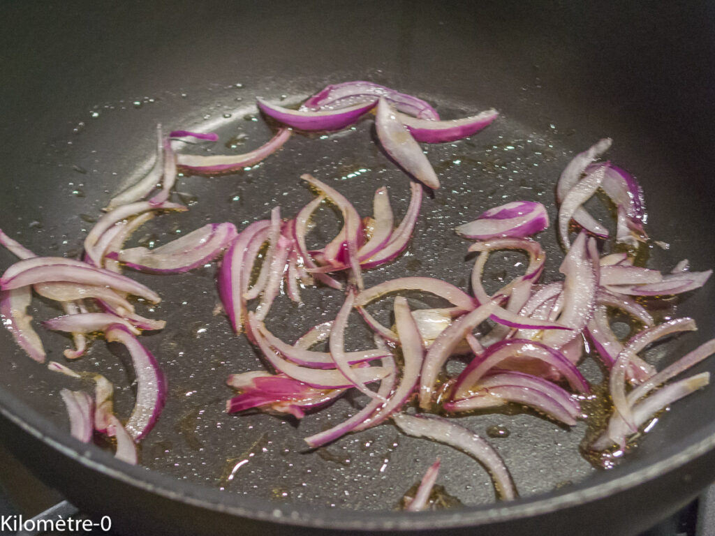 Épluchez et émincez l’oignon. Faites-le revenir dans un peu d’huile dans une poêle ou cocotte à couvert environ 5 minutes à feu doux.