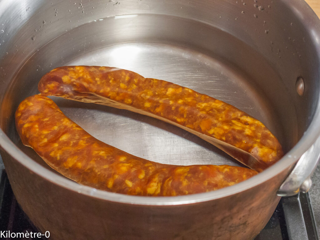 Pendant la cuisson des aubergines, faites cuire les saucisses.