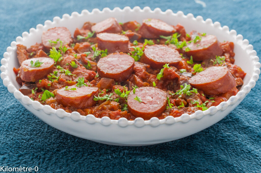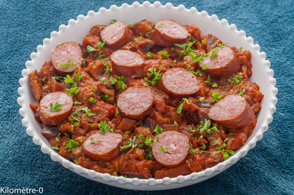 J’ai remplacé la saucisse de Morteau par de la saucisse montbéliarde. La gourmandise était au rendez-vous, comme je l’imaginais. Je ne sais pas si vous réussirez à trouver des aubergines mais je vous la poste à tout hasard. Sinon, vous la ferez l’an prochain.