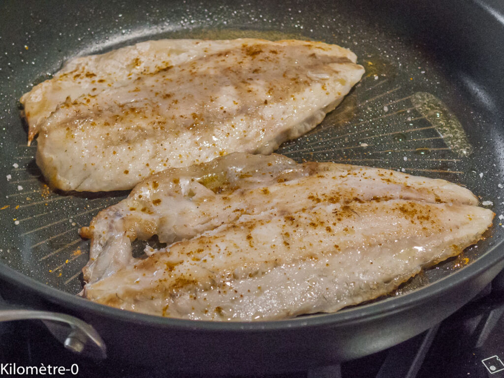 Retournez les filets au bout de 2 ou 3 minutes. Salez, poivrez, ajoutez des épices spécial poisson si vous en avez et aimez.