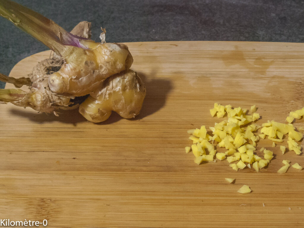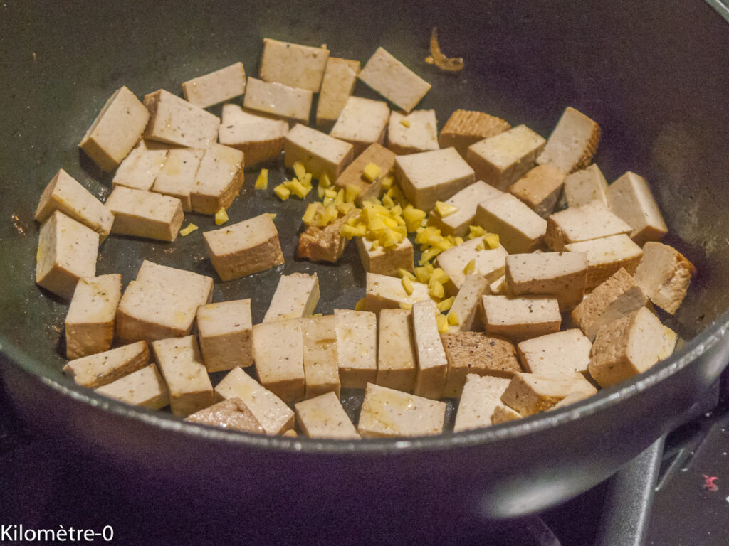 Dans une poêle, faites chauffer un peu d’huile, ajoutez le tofu et le gingembre et faites les revenir 5 minutes.
