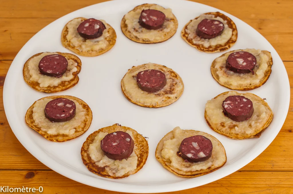 Blinis à la farine d’épeautre au boudin noir et aux poires
