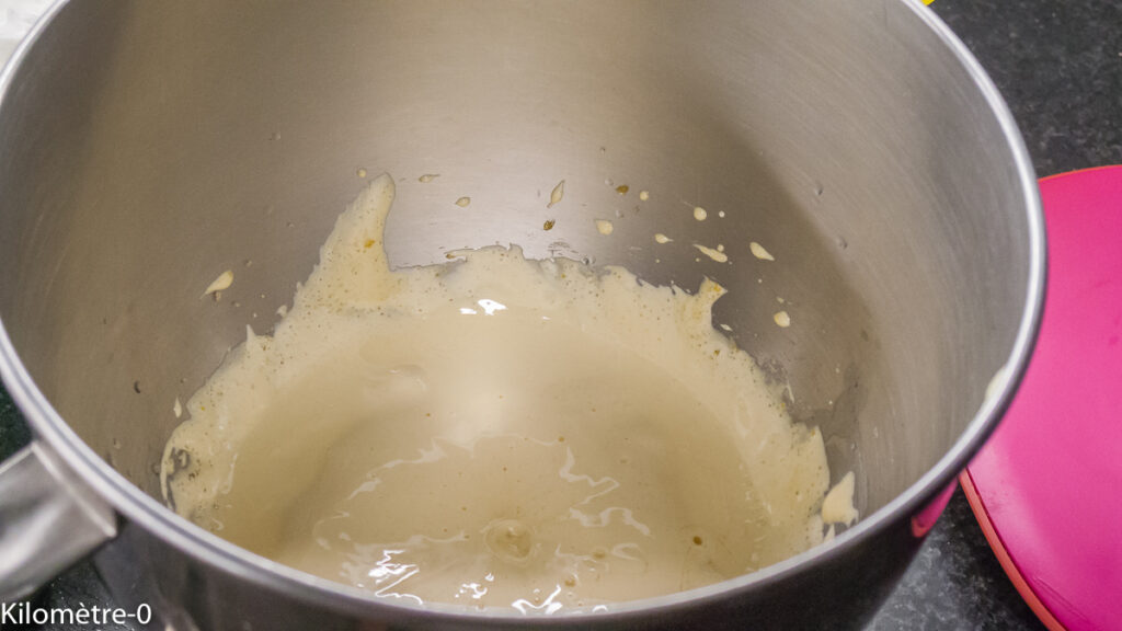 Faites monter les jaunes avec 80 g de sucre jusqu’à ce que le mélange blanchisse.