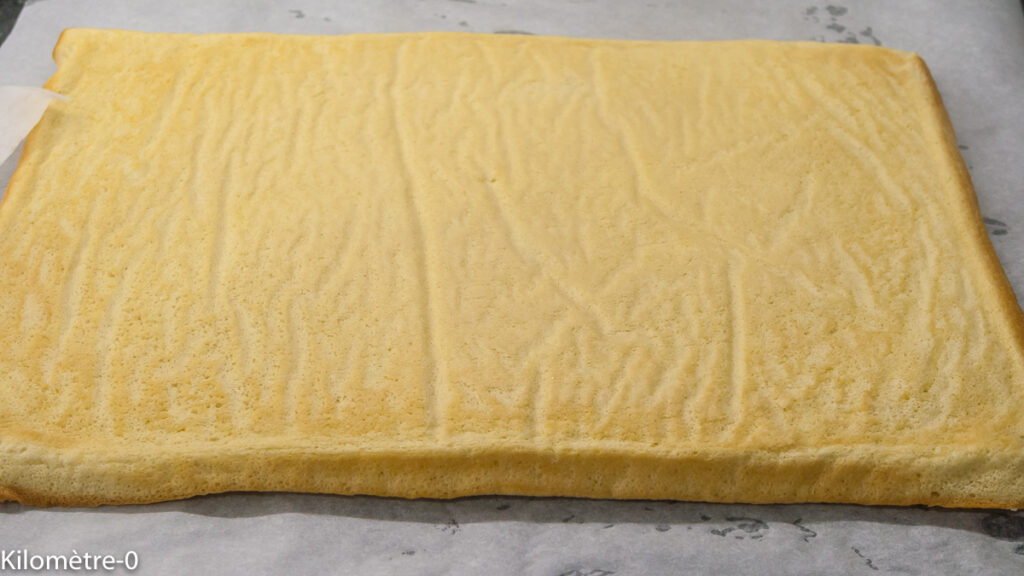 Quand le biscuit est cuit, laissez-le glisser avec le papier sulfurisé sur un plan de travail fariné.