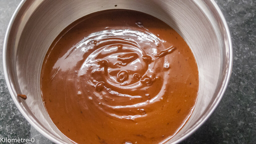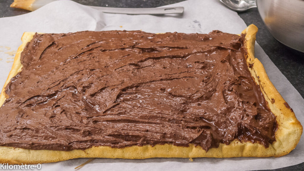 Avec une grande spatule, étalez la mousse de chocolat quand le biscuit commence à refroidir.