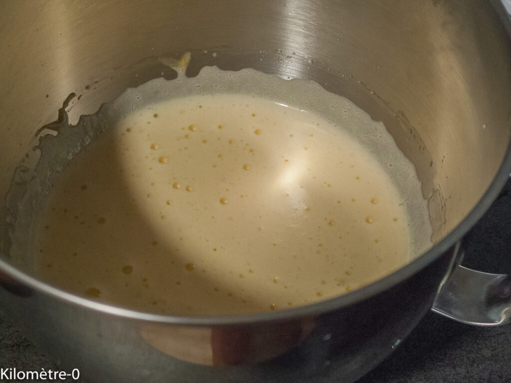 Fouettez les oeufs et le sucre jusqu’à ce que le mélange monte bien.
