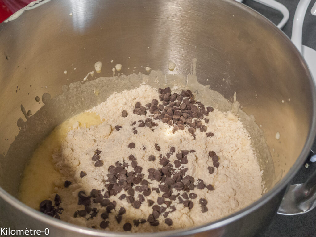 Ajoutez la farine d’épeautre avec la farine d’amande, le bicarbonate et les pépites.