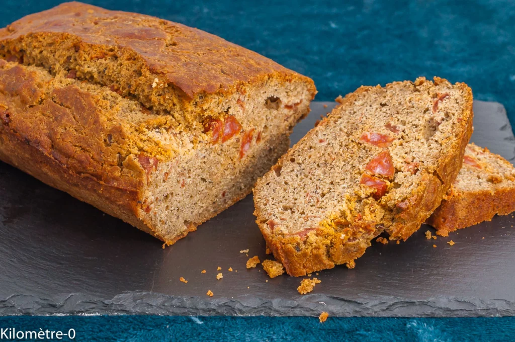 Cake rustique à la farine de pois chiches et de blé noir, au chorizo et tomates confites