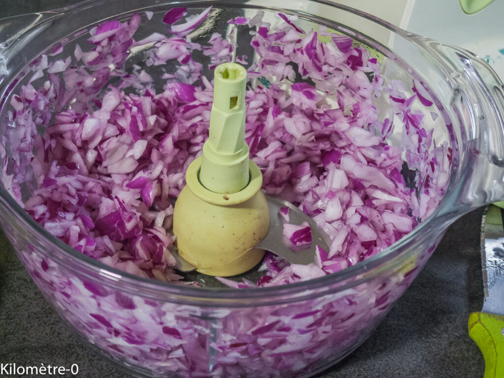 Pelez les oignons et émincez-les. Si vous avez un mixeur, ce sera parfait. Sinon, munissez-vous de lunettes de piscine pour ne pas pleurer 🙂
