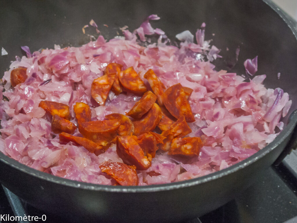 Mettez-les dans une poêle à couvert avec un peu de matière grasse. Au bout d’une demi-heure, ajoutez le chorizo coupé en morceaux (j’ai mis du doux pour profiter de toutes les saveurs des ingrédients) ….