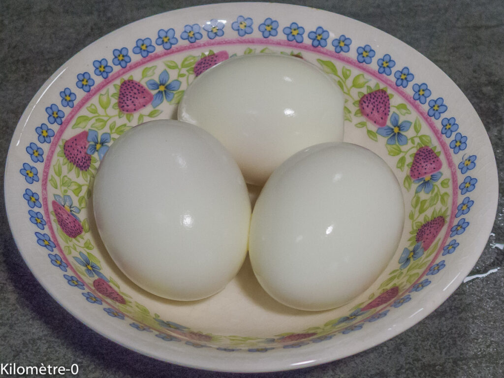 Pendant que les céleris cuisent dans la poêle ou la cocotte, cuisez les oeufs 9 minutes dans une casserole contenant de l’eau bouillante légèrement salée.