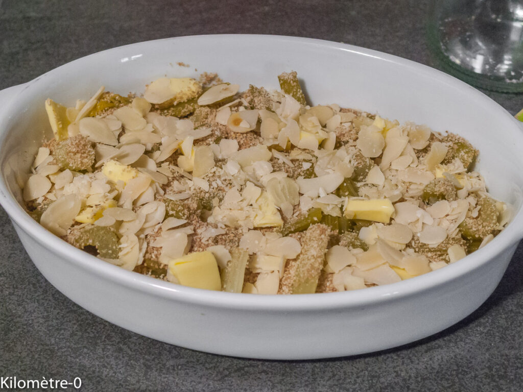 Versez le contenu de la poêle dans un petit plat allant au four. Recouvrez de chapelure, d’amandes effilées et répartissez le reste de beurre dessus.