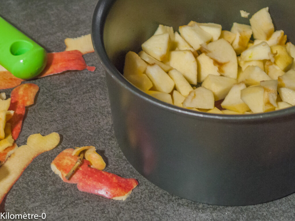 Pendant longtemps, je choisissais des pommes qui fondent à la cuisson de type jonagored. Et bien là, j’ai mis des galas car c’est ce que j’avais sous la main. Elles fondent un peu moins facilement à la cuisson mais il suffit juste de les mixer ensuite. Ces pommes sont mes préférées car elles sont douces et sucrées.