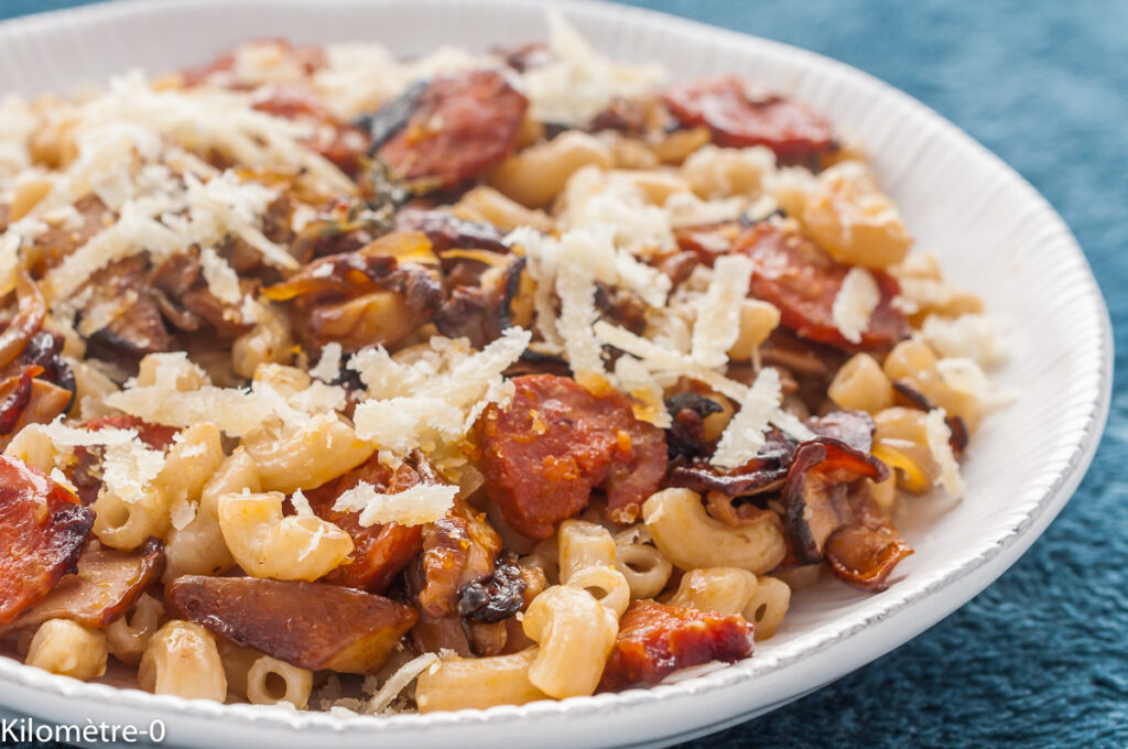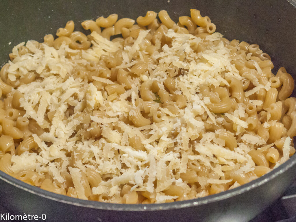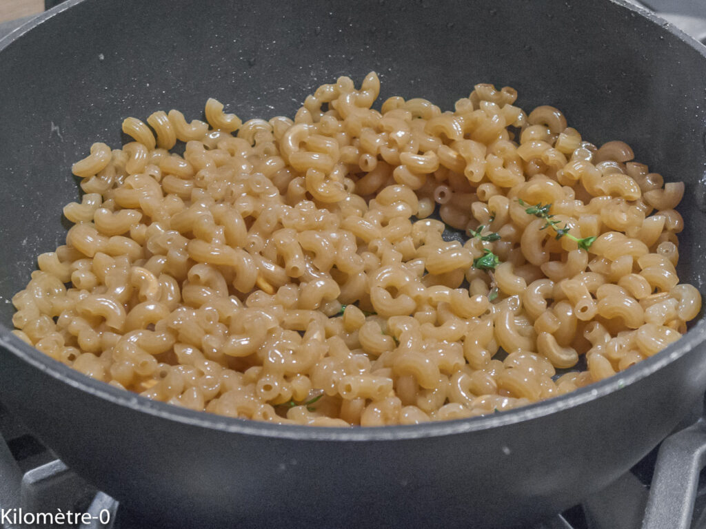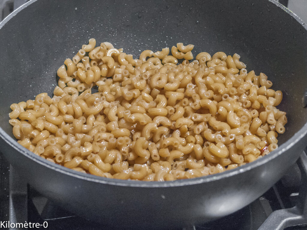Ajoutez les coquillettes et mélangez en laissant le feu dessous deux ou trois minutes en remuant souvent.