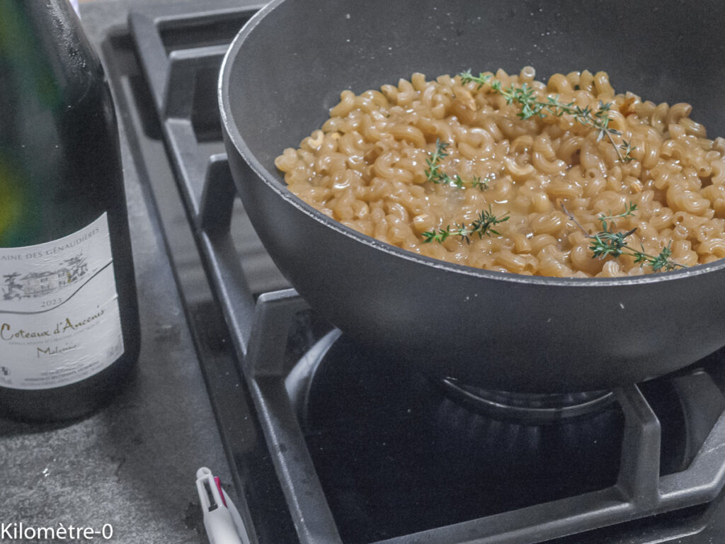Ajoutez le bouillon louche par louche et remuez régulièrement. Arrêtez quand les pâtes sont al dente (durée de cuisson sur l’emballage). Cela va vous prendre peut être un quart d’heure si ce sont des pâtes semi complètes.