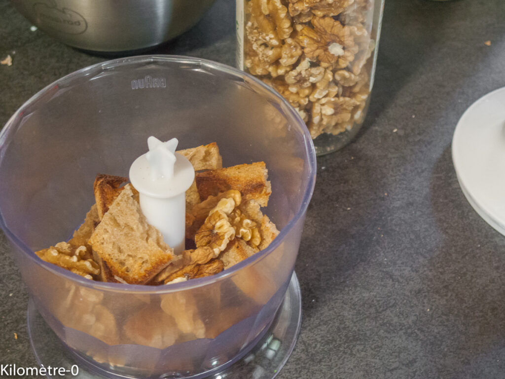 Faites griller du pain si vous en avez (sinon optez pour de la chapelure, moins économique). Mixez-le avec les noix grossièrement.