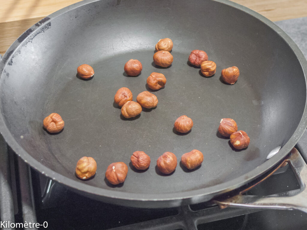 Grillez à sec les noisettes et concassez-les grossièrement.