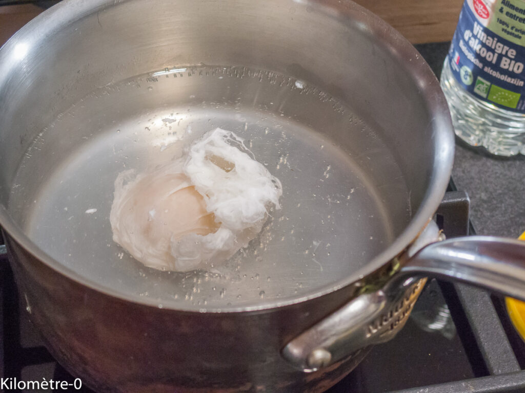 Cassez un oeuf dans un petit bol. Avec une cs, faites un tourbillon dans l’eau et déposez-y l’oeuf.