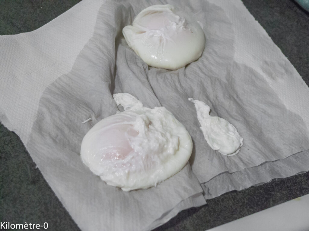 Quand il est cuit, enlevez-le et déposez-le sur du papier absorbant (au bout de deux ou trois petites minutes- il faut que le blanc soit bien pris).