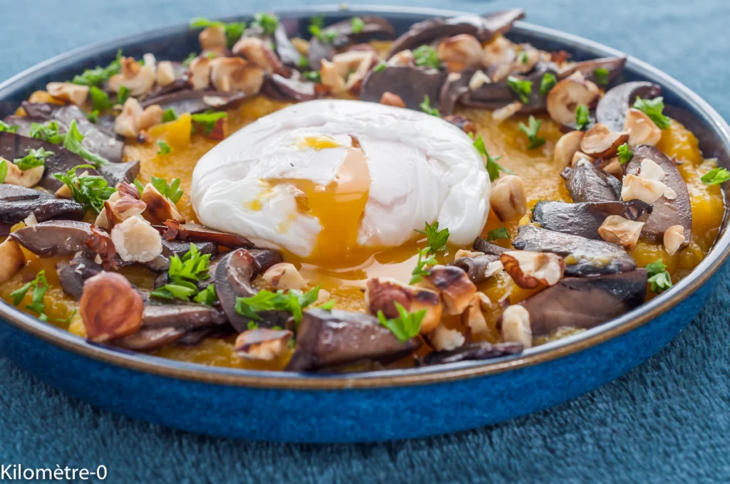Courge butternut aux champignons, noisettes et oeuf poché - Recette Kilomètre-0