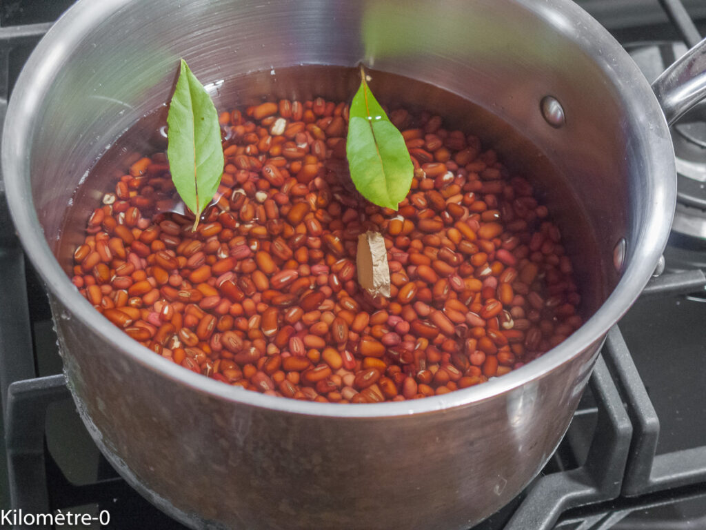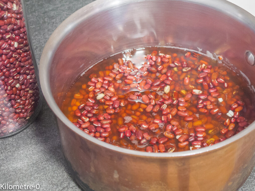 Mettez les haricots azuki dans une casserole ou un grand saladier d’eau froide 8 à 12 h. Vous pouvez aussi ajouter une cc de bicarbonate de soude qui rend plus digeste les haricots.