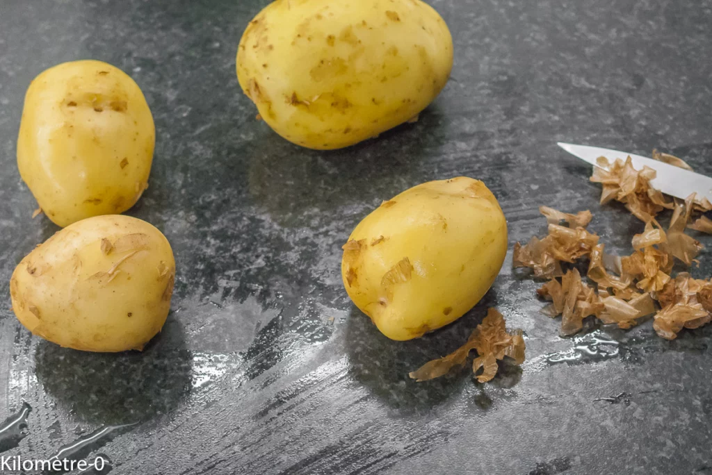 Comme elles sont chère, grattez les pommes de terre nouvelles pour enlever la peau.C’est  une étape facultative, vous pouvez bien évidemment laisser la peau, surtout si elles sont bio. Bon, moi, je préfère sans.