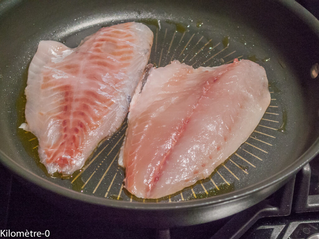 Sinon, essuyez-les et mettez-les à cuire dans une grande poêle huilée à couvert 5 petites minutes. Retournez les filets, salez-les, poivrez-les et parsemez d’épices. Continuez de les cuire 3 minutes à couvert. Ce temps devrait être suffisant. Si ce n’est pas le cas, poursuivez un peu. Attention, un poisson trop cuit est moins bon. Il faut arrêter la cuisson quand il est juste cuit (on le voit à la couleur, bon, je mesure que de loin, ce n’est pas facile à expliquer, au départ, il affiche une espèce de transparence qui s’efface à un moment. Là, il est cuit, il ne faut pas poursuivre la cuisson à partir de cette belle couleur).
