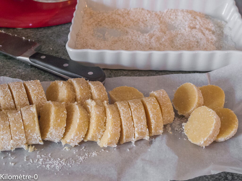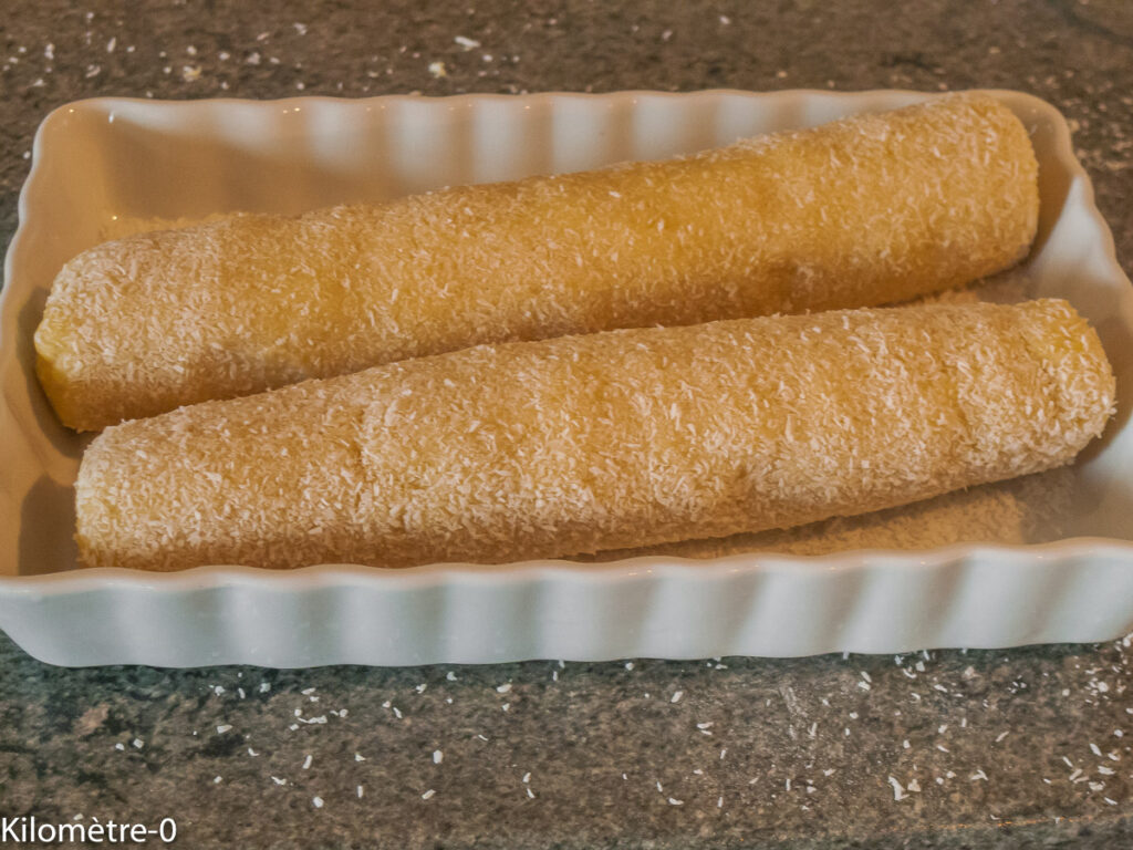 Divisez la pâte en deux et formez des boudins. Moi, j’ai commencé à les rouler dans la noix de coco restante mais vous pouvez juste rouler les boudins et attendre pour les rouler dans la noix de coco.