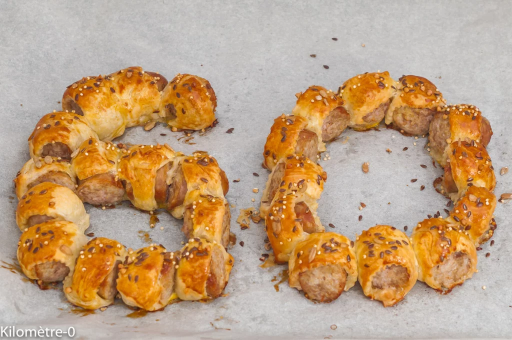 J’avais fait avec mon filleul une couronne de saucisses avec de la pâte à pizza pour Noël. Cette fois, pour un anniversaire, j’ai fait des feuilletés apéro type number cake. C’est très facile à faire et c’est plus gourmand quand c’est fait maison si on achète les saucisses chez un bon charcutier.