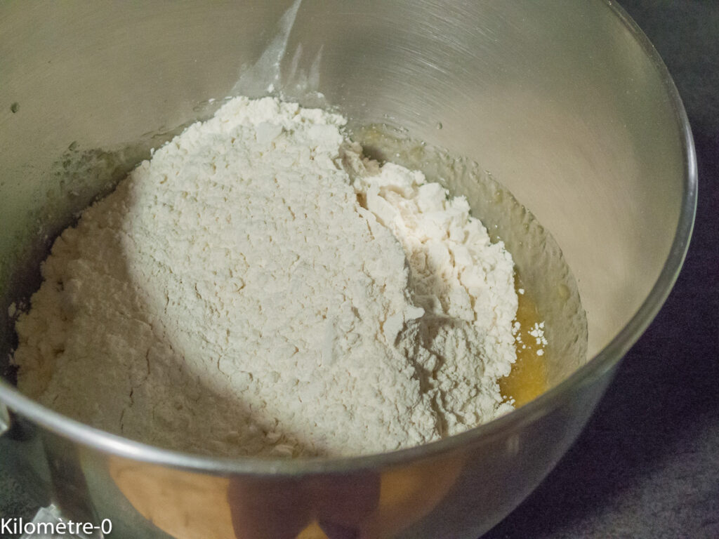 Ajoutez la farine mélangée avec de la poudre à lever ou du bicarbonate de soude.