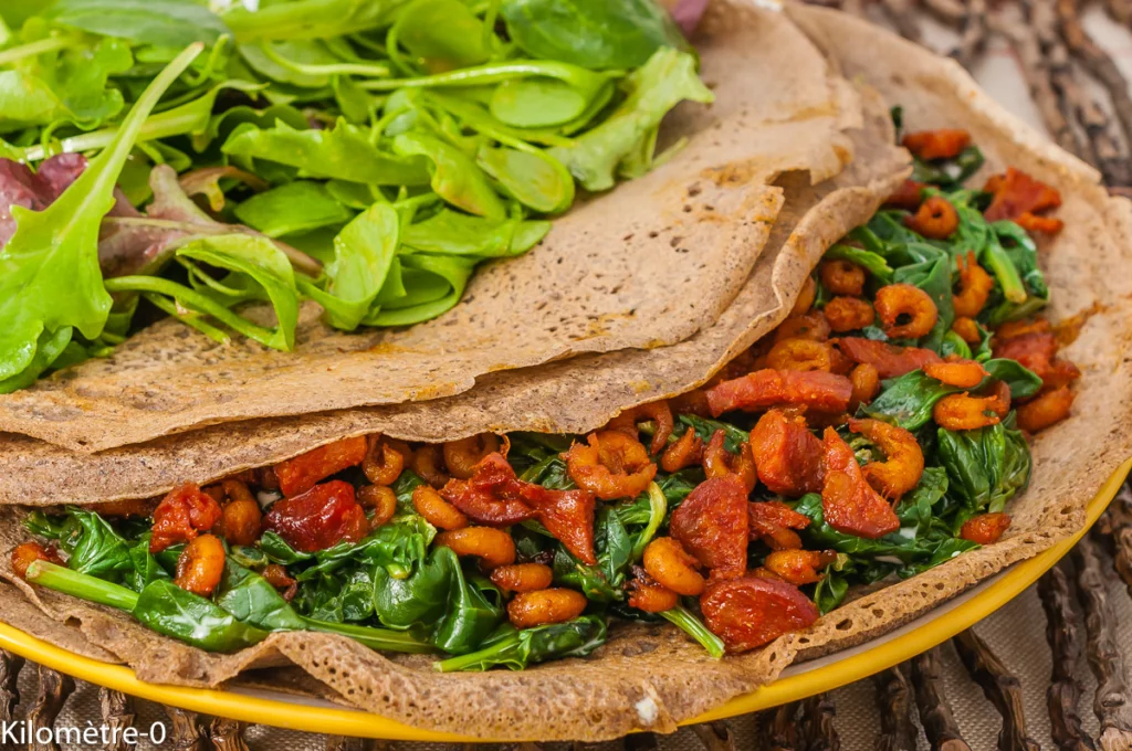 Galettes bretonnes aux épinards, chorizo et crevettes grises - Recette Kilomètre-0