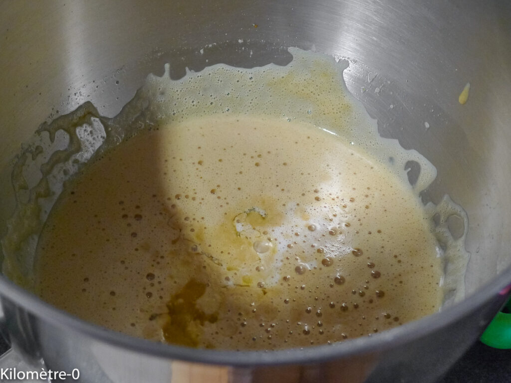 Incorporez le beurre fondu et le lait et mélangez.