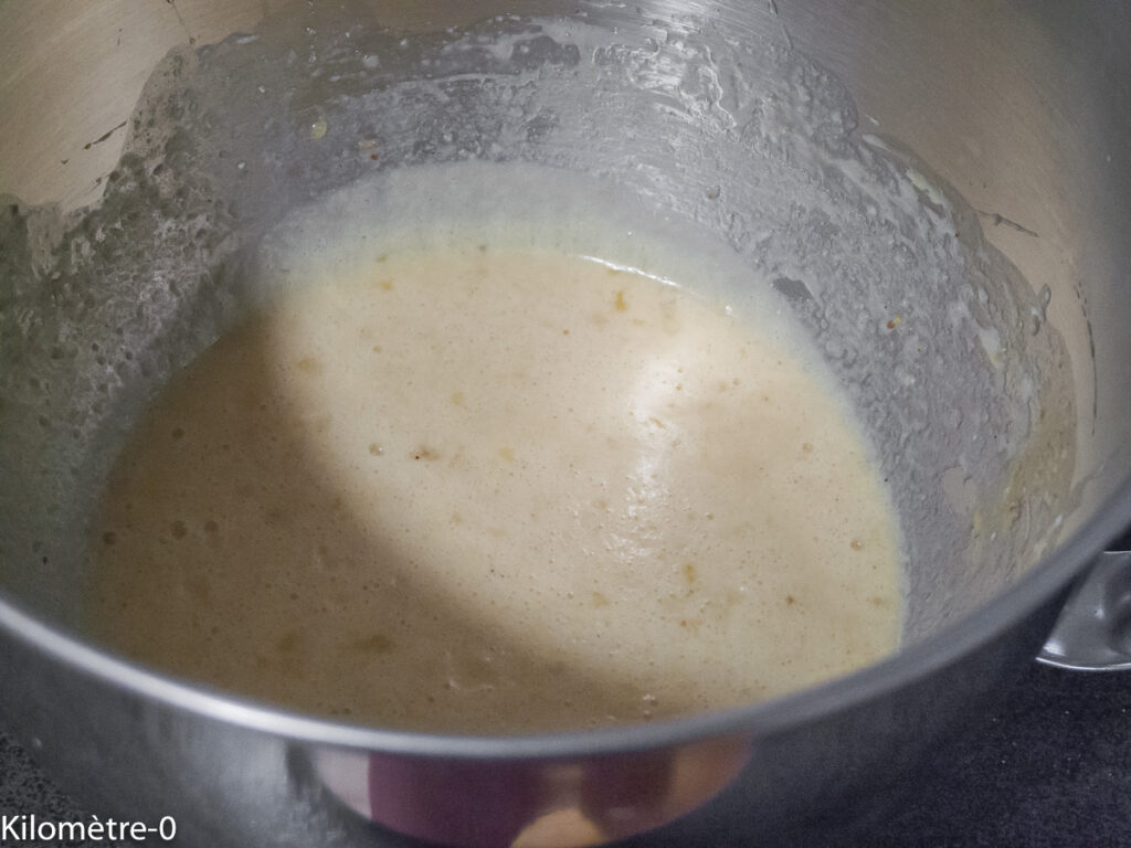 Dans un bol mélangeur, versez les œufs, les bananes mixées, le sucre, le beurre fondu, le lait entier et la vanille en poudre.