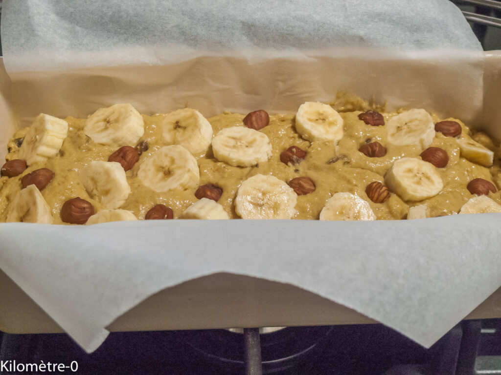 Ajoutez la dernière banane coupée en rondelles et les noisettes légèrement enfoncées dans la pâte.