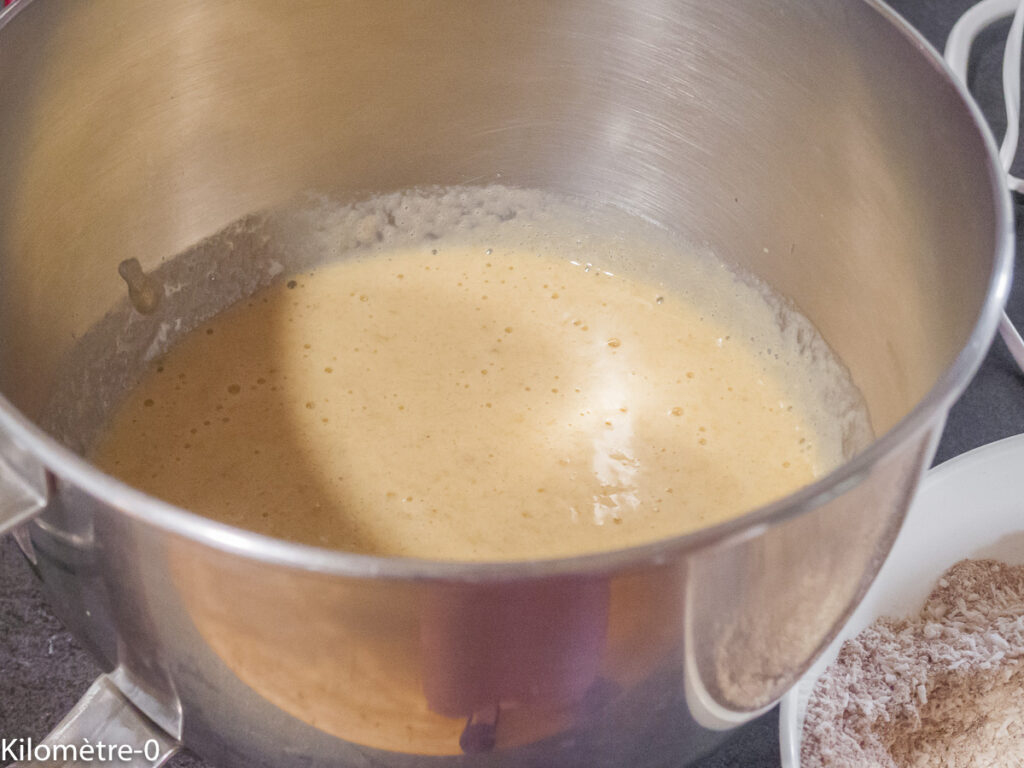 Mélangez sans insister et versez la pâte dans un moule siliconé ou beurré et légèrement fariné.