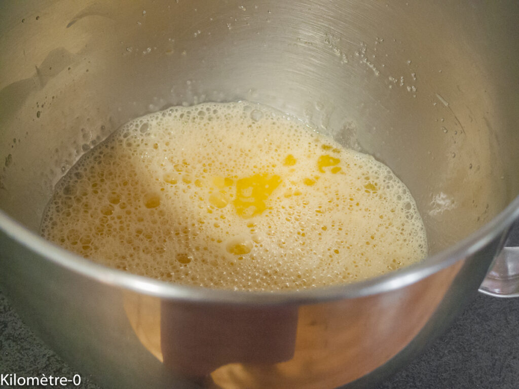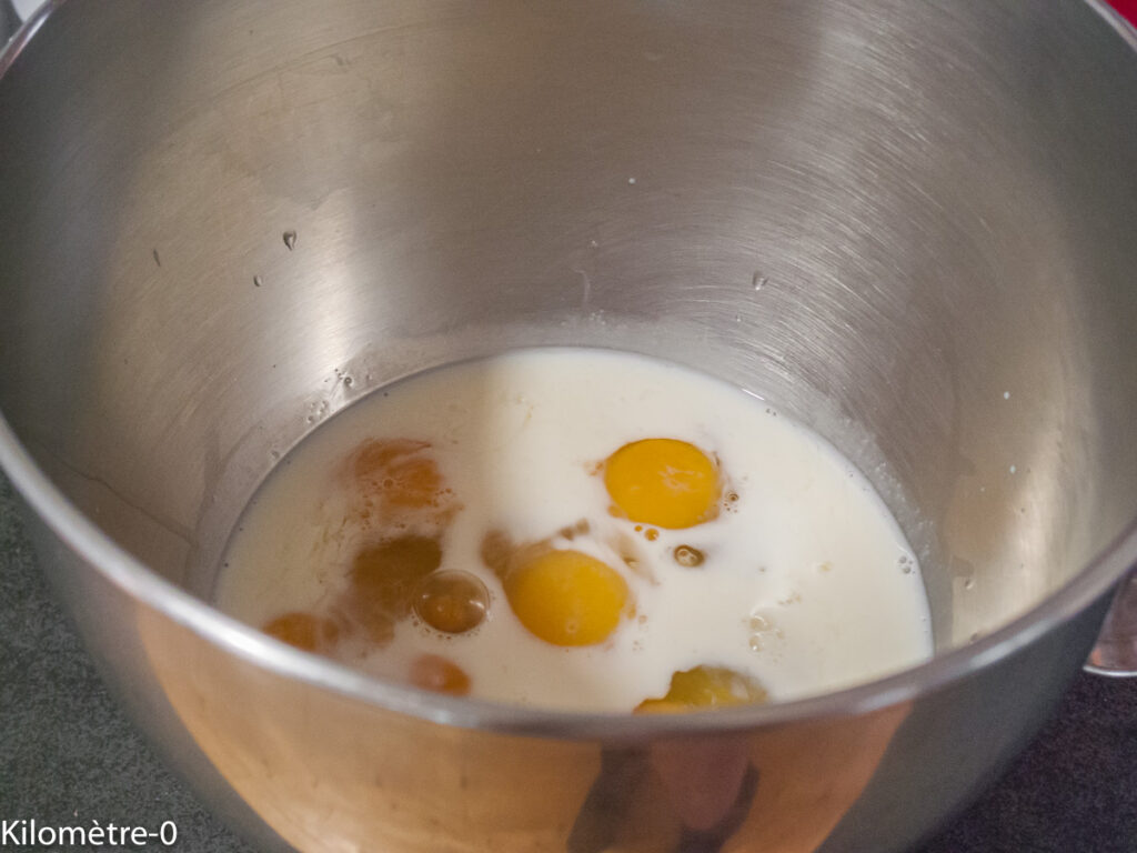 Battez le lait avec le sucre et les oeufs.