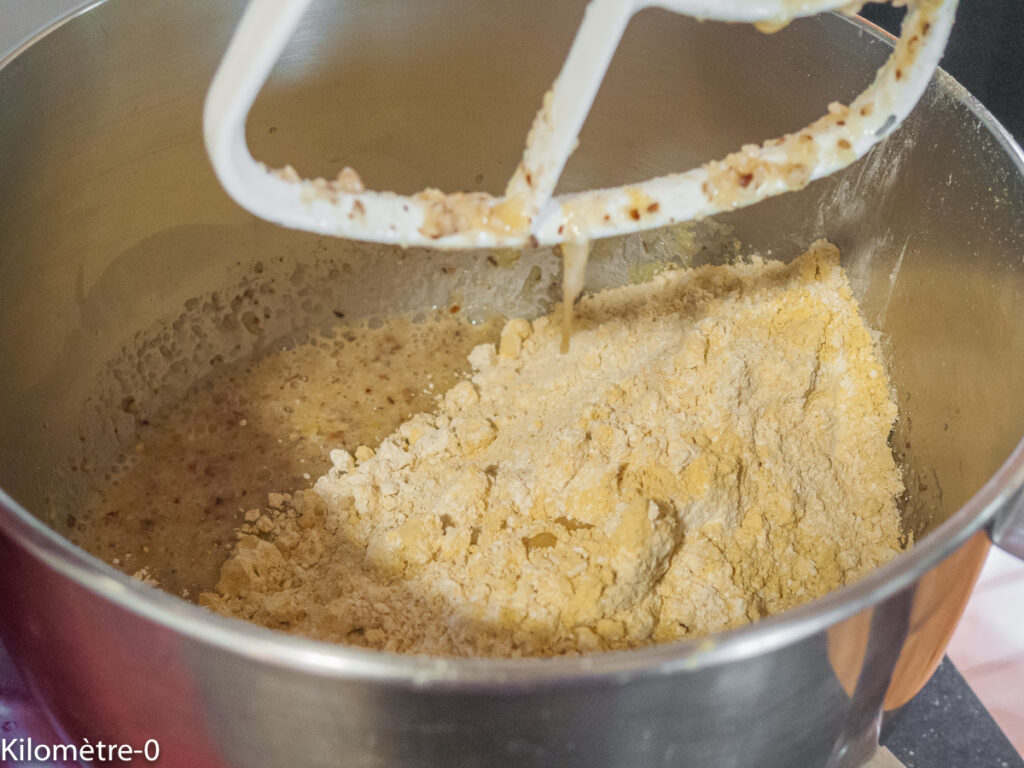 Incorporez ensuite les farines tamisées avec le bicarbonate de soude. Continuez à mélanger.