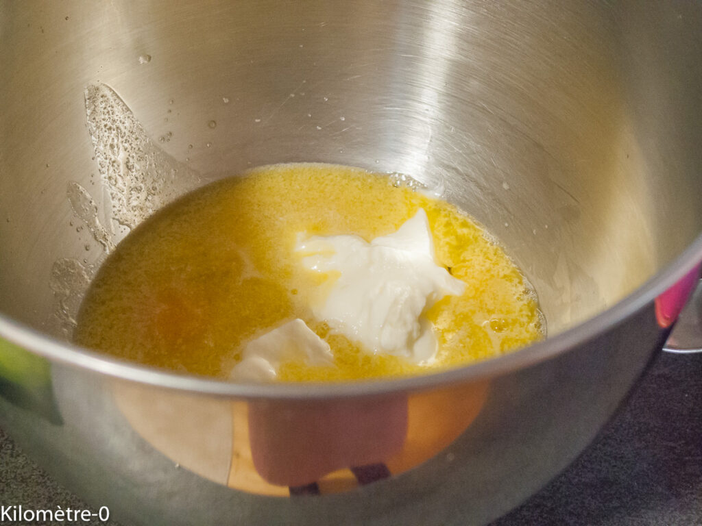 Versez dans un gros bol mélangeur le beurre fondu avec le sucre de canne, les oeufs et le yaourt.