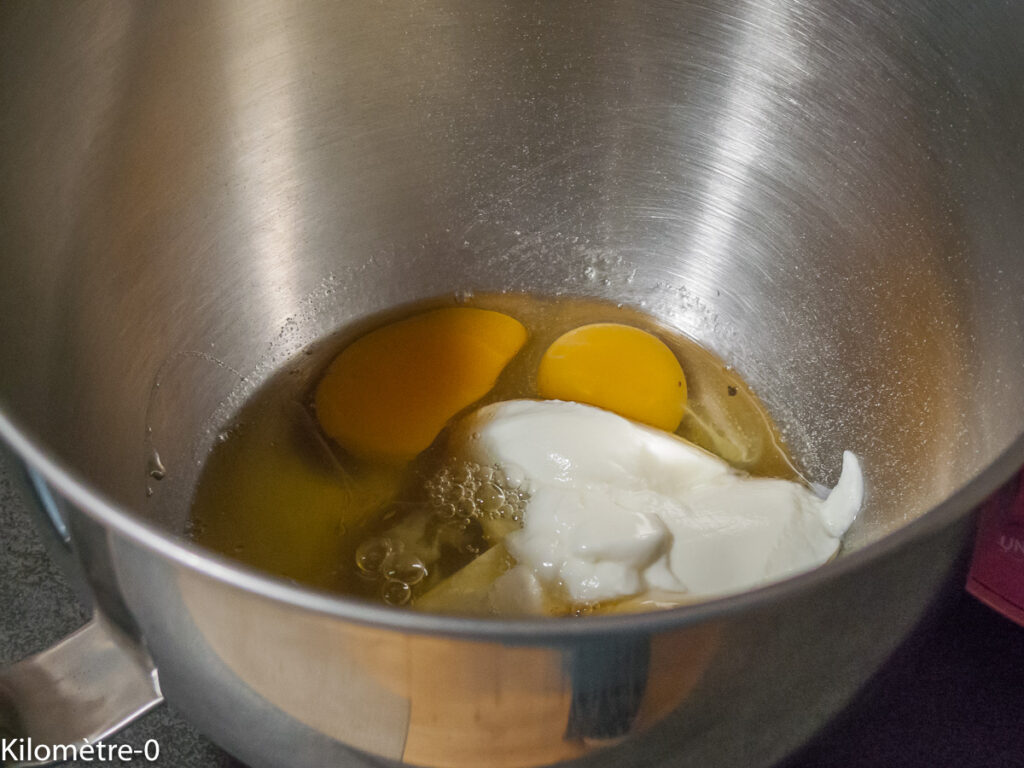 Mettez le sucre, les oeufs, les blancs d’oeufs et le yaourt dans un grand bol mélangeur.