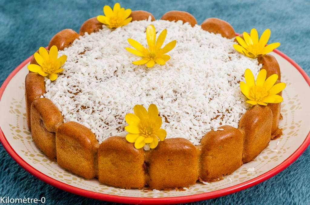 Démoulez pour servir. Je l’ai saupoudré de noix de coco râpée. Je trouve que le sucre glace fond et que du coup, il faut en mettre beaucoup, ce qui n’est pas trop bon pour nous.