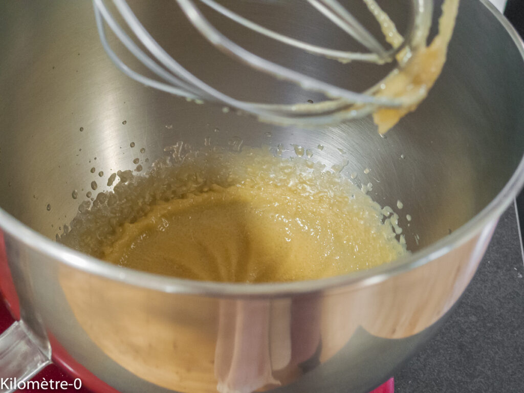 Ajoutez deux œufs préalablement battus et continuez de fouetter jusqu’à ce que le mélange soit bien mousseux.
