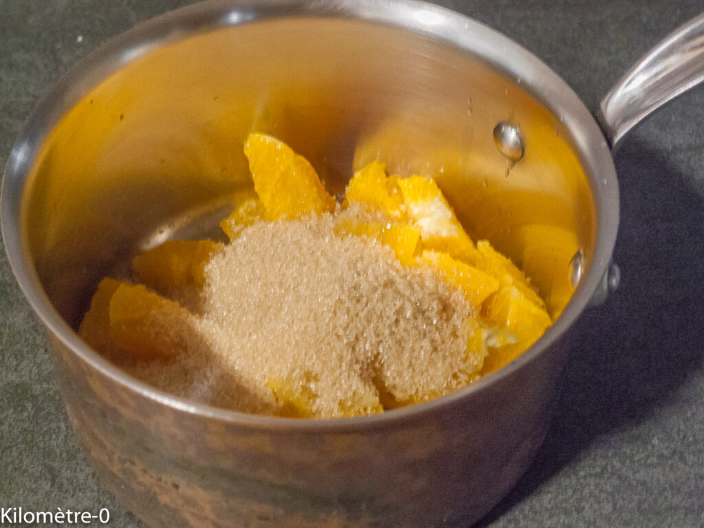 Mettez-les dans une casserole à fond épais et versez du sucre dessus. J’ai mis 80 g car je ne suis pas un bec sucré et mes oranges étaient très douces mais certaines personnes mettent un poids identique aux fruits soit ici 240 g. A vous de voir combien vous souhaitez en mettre. Pour info, on en mettra aussi ensuite dans la pâte à gâteau.