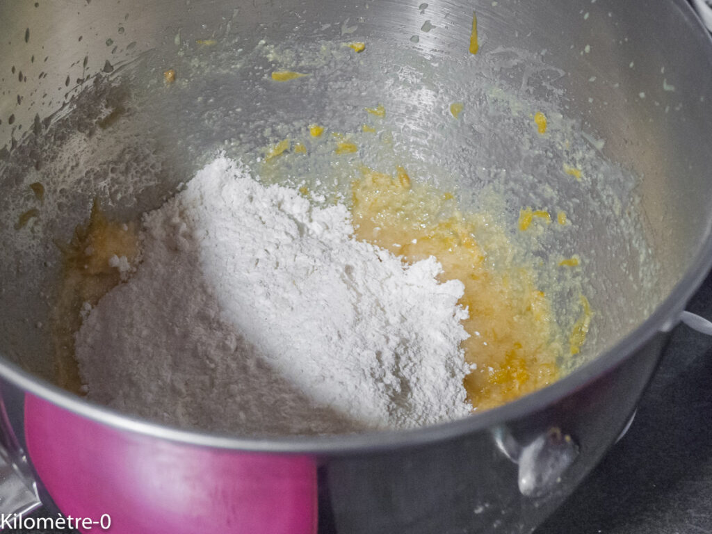 Versez la poudre d’amandes, la farine et la fécule mélangées préalablement à la poudre à lever.