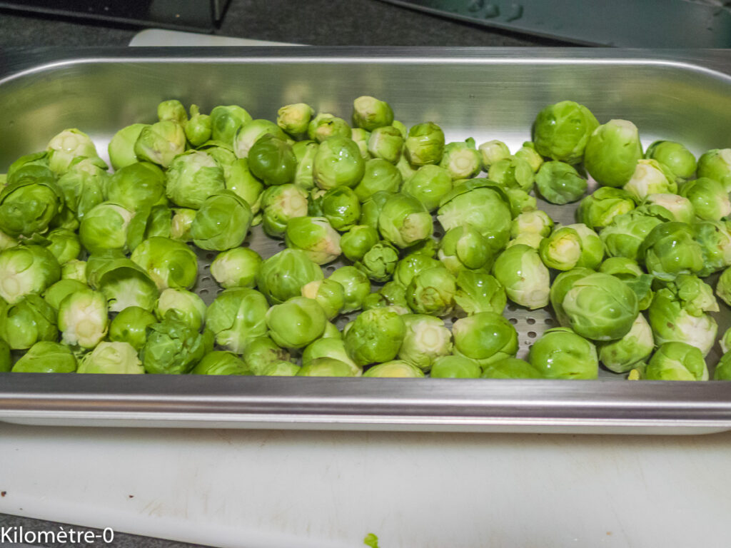 Enlevez les feuilles abimées des choux de Bruxelles et lavez-les. Coupez-les en deux s’ils sont gros et faites-les cuire 7 minutes à la vapeur (four ou cuit vapeur) ou dans de l’eau bouillante salée.