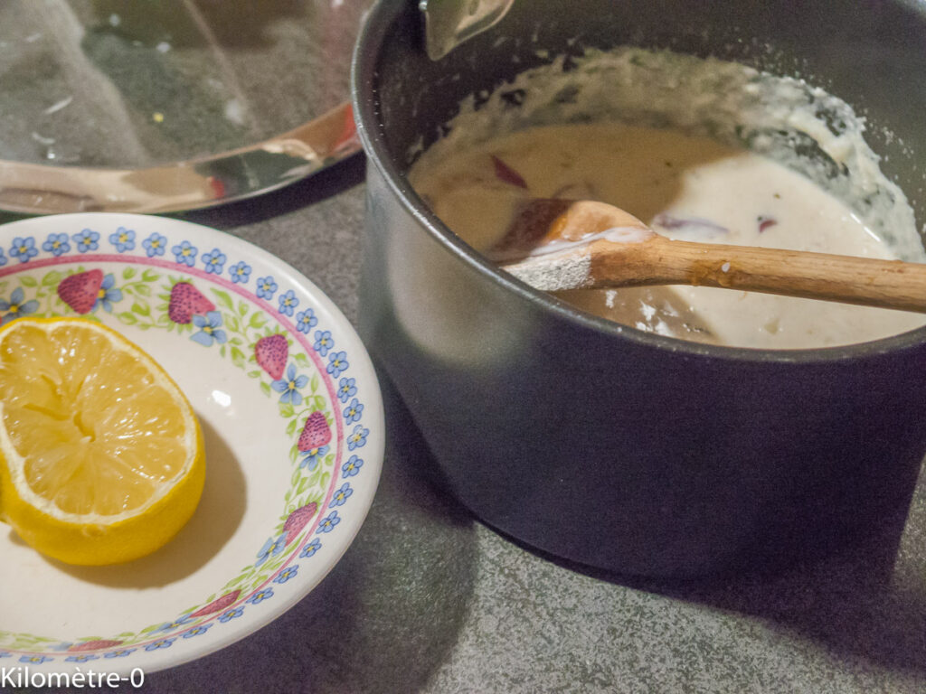 Ajoutez la farine, mélangez bien et versez la crème et le lait. Vous pouvez mettre à la place de la crème une crème végétale plus légère.