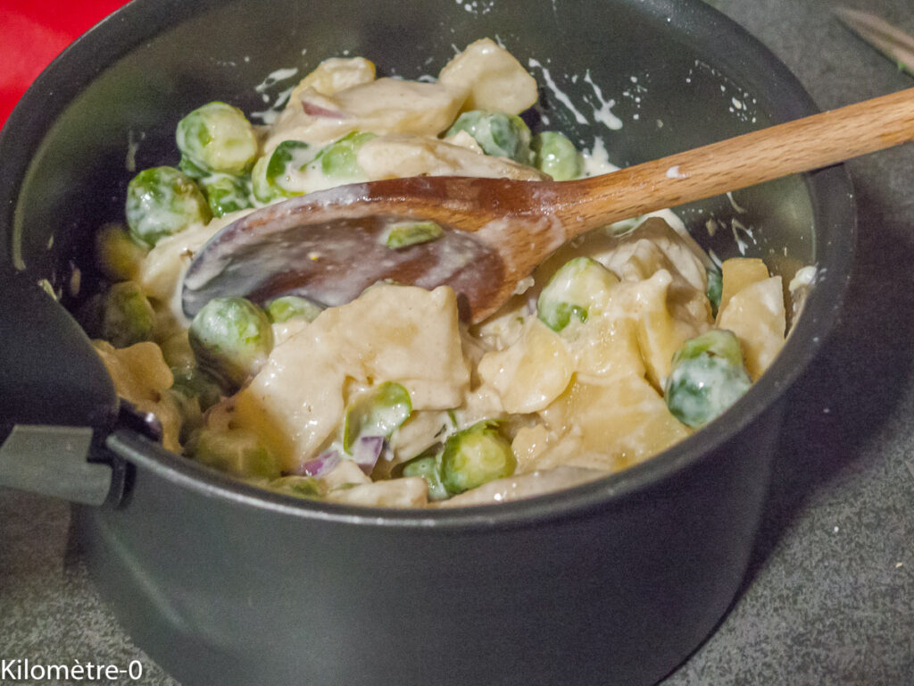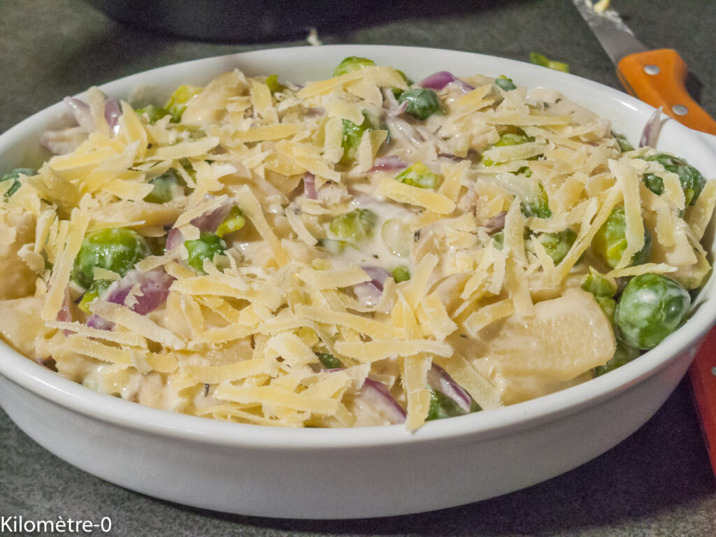Photo de recette de gratin, automne, hiver, chou, choux de Bruxelles, fruits, pommes, béchamel, facile, rapide, healthy, béchamel, bio,  Kilomètre-0, blog de cuisine réalisée à partir de produits de saison et issus de circuits courts
